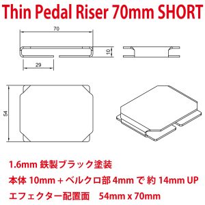 Thin Pedal Riser 70mm SHORTのかさ上げ量は14mmで100mm STANDARD版と同じです。14mmのかさ上げ量は慎重な検討の結果、絶妙な高さとして決定されました。ARMORやキョーリツKCシリーズなどの枠のあるエフェクトボードでは、エフェクトボードのフレームとジャックが干渉してしまうことがありますが、14mmのかさ上げにより、多くのエフェクトでこの問題を解消できます。また過度に高すぎることはありません。
